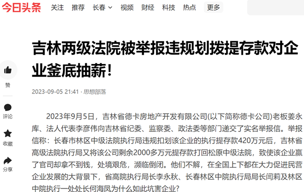 吉林两级法院被举报违规划拨提存款对企业釜底抽薪!