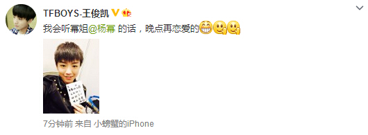 11月25日下午TFboys王俊凯更新微博,文中写到:“我会听幂姐的话晚点恋爱。”,并附上一张图,照片中王俊凯微笑着手里面难着杨幂的亲笔签名。