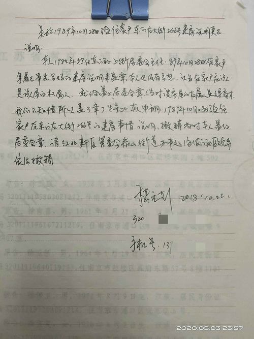 2018年10月22日,南京市浦口区泰山街道沧波门社区居民委员会(原东门镇左所大街居民委员会)嵇某莉主任,申明当时误盖,承认当时该房屋的权属人是我父亲的。