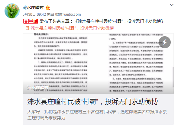 在中国政府网的国家政务服务平台及社交平台上,村民李进水等通过文字、图片、视频等,列举涞水县庄疃村杨氏宗族恶势力——前任党支部副书记现任村主任杨志国、县政协委员杨志刚、原村主任杨爱国、县人大代表杨爱民利用其身份和宗族势力“违规选举”、“非法采砂”、“侵吞集体财产数百万元”、“强占村民土地十多年不还”等累累村霸行为。笔者简单整理了下。